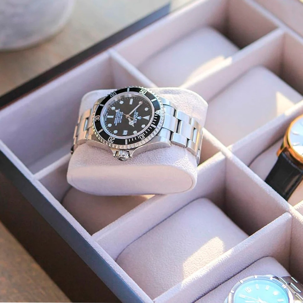 El interior suave y acolchado cuida cada reloj, evitando rayaduras y daños, mientras que el acabado en madera sólida asegura una durabilidad que acompaña a tu colección durante años.